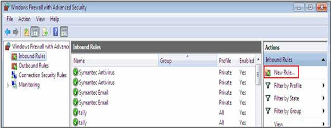 - Under Actions of Inbound Rules, click New Rule (Right hand side).