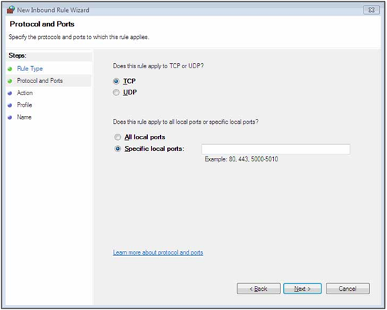 - Under Does this rule apply to all ports or specific local ports? Select the option Specific local ports.