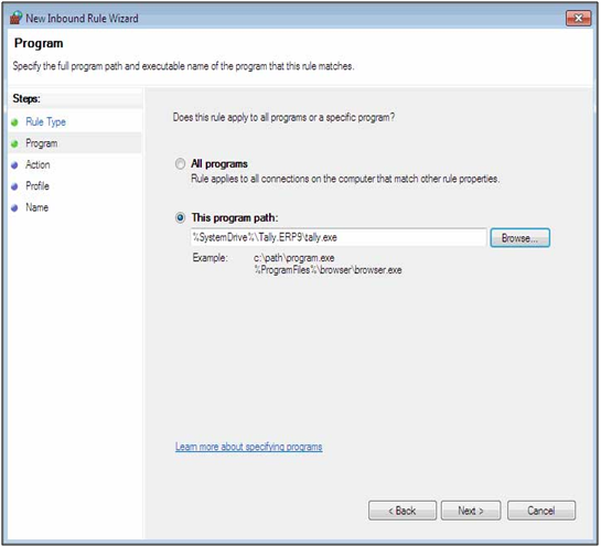 The Program screen appears, to specify the full program path and executable name of the program that this rule matches, as shown: