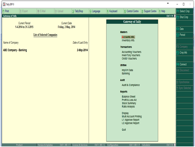 - Go to Gateway of Tally >Account info